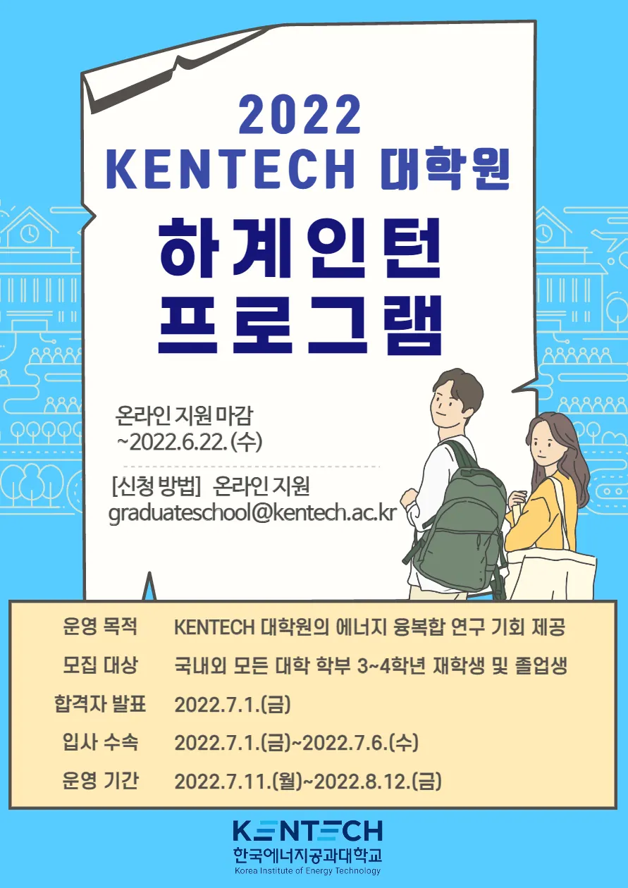 KENTECH์ ํ๊ณ์ ๋๊ณ ๋ํ์ ๊ณต์ ์ธํด ํ๋ก๊ทธ๋จ์ ์ด์ํ๊ณ ์์ต๋๋ค. ๊ด์ฌ ์๋ ๋ชจ๋ ๋ํ ํ๋ถ 3~4ํ๋